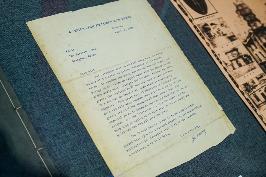 他将珍藏的一封美国教育学家杜威致戈公振信函捐赠博物馆,这封信写于1919年5月15日,夸赞了时报馆高超的印刷技术。戈公振时在时报馆任职,次年《时报·图画周刊》创刊,此信于10月8日发表。